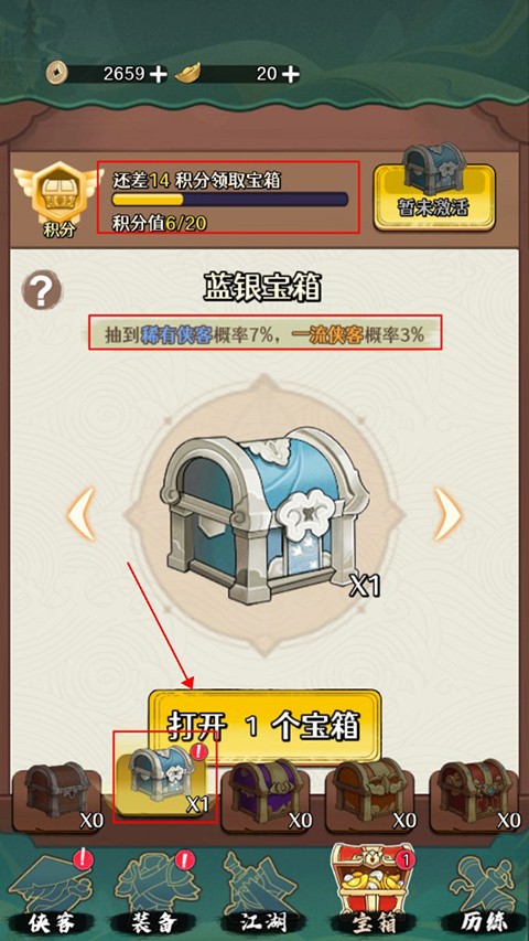4、通过闯关和参与活动可获得宝箱,宝箱品质越高,开出的侠客稀有度越高,还能积累积分,达到指定分数可解锁额外奖励。