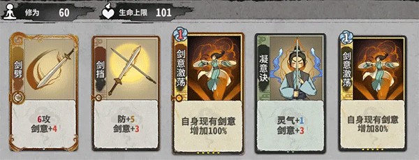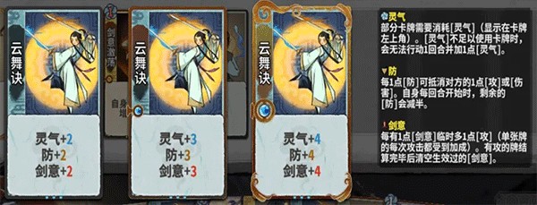 剑意:使下一张的攻击临时获得加成。(剑意的效果可以给下一张牌的每一段攻击,所以,一般是多段攻击吃剑意。比如,我有2剑意,下一张牌为2攻x3,那么可以造成12点伤害。)