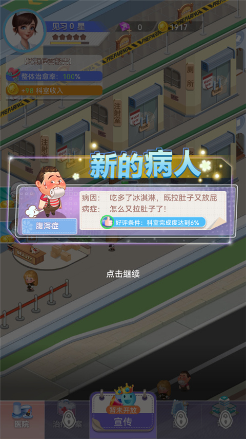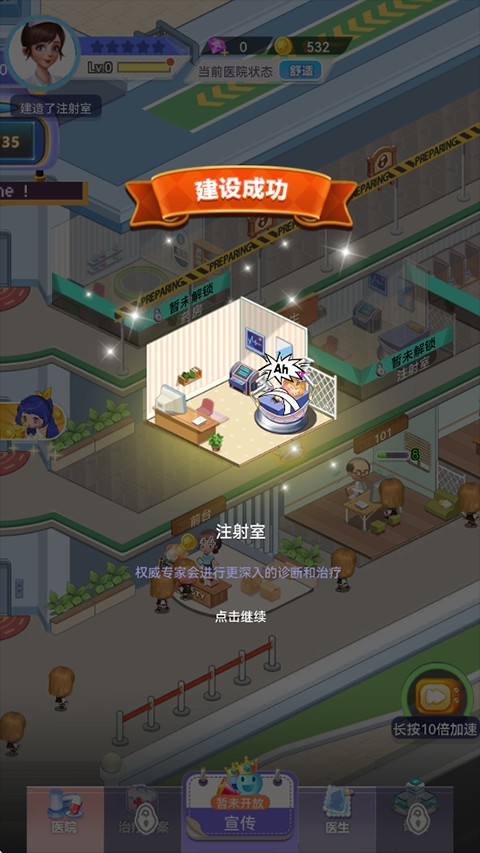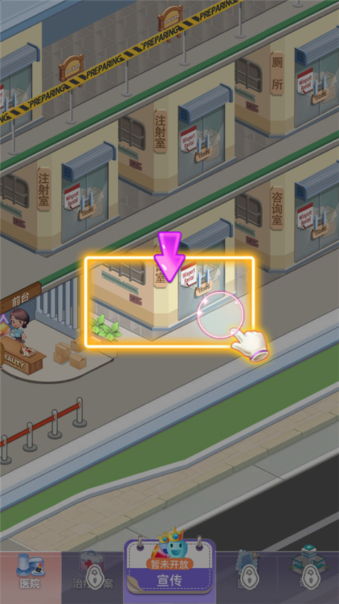 通过解锁和建造更多的科室来扩展医院空间。选择“咨询室”建筑进行操作,可以扩展排队扩容。