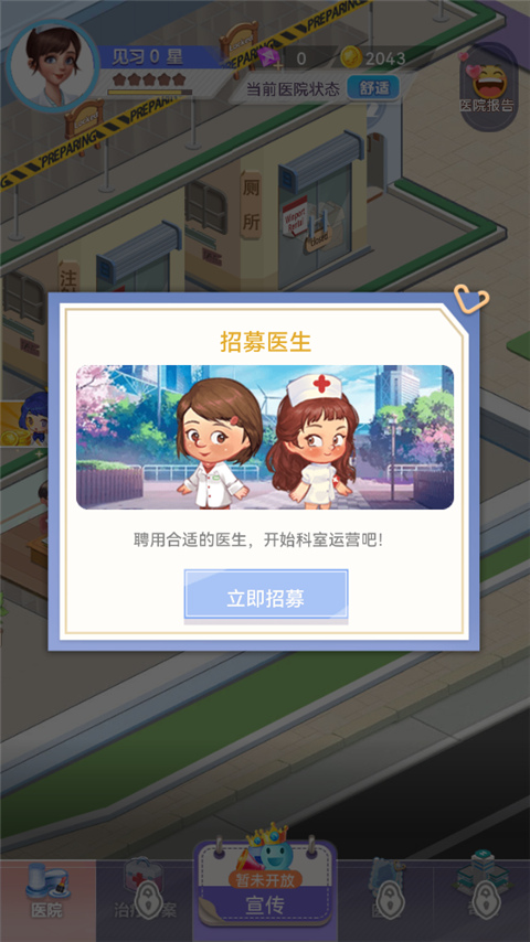 1、打开游戏后,点击【注射室】图标。进入界面后,点击【立即招募】图标,再点击【免费招募】图标即可招募注射室医生。