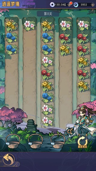 一共有五条路上的不同鲜花,玩家需要一次性将同一种鲜花放到3个篮子里面,每次只能选择一条道路上的头一束花。