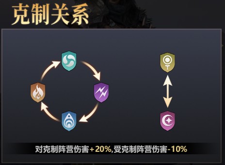 水系、火系、风系、雷系、光系、暗系。其中水火风雷互相克制,光暗互克,对克制阵营增加20%伤害,受到克制阵营的伤害减少10%。