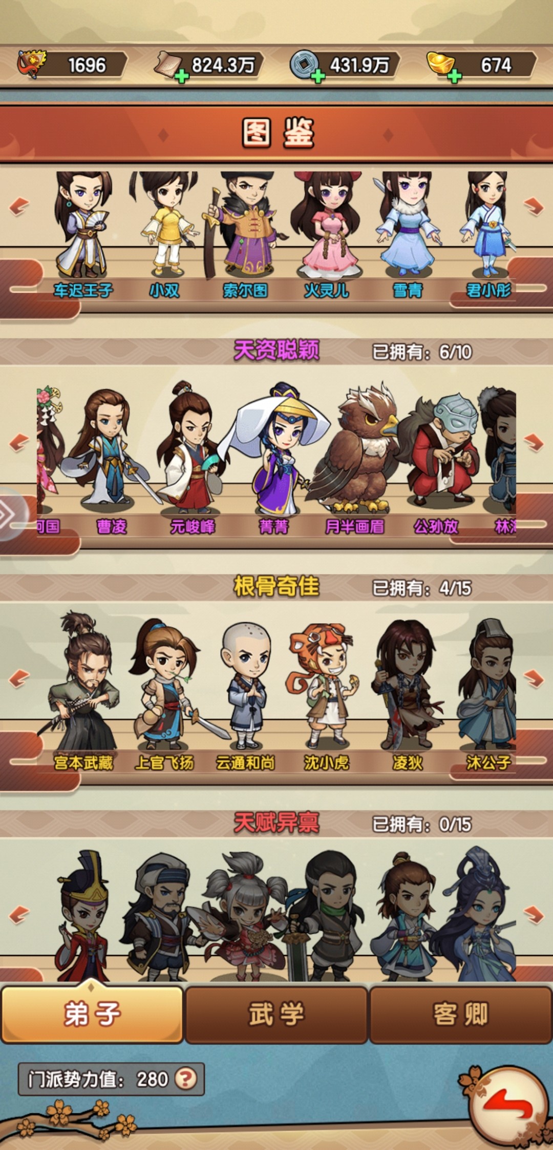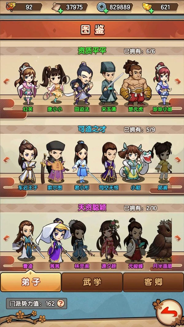包含弟子、武学、客卿三个图鉴合集,前期主要是完成任务的方式获得弟子、武学以及客卿,当完成招募条件时,可在图鉴处招该弟子或客卿。