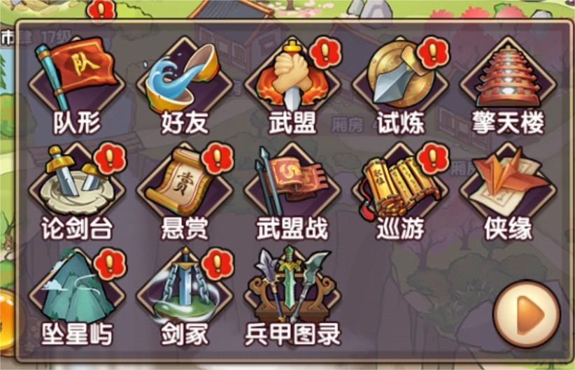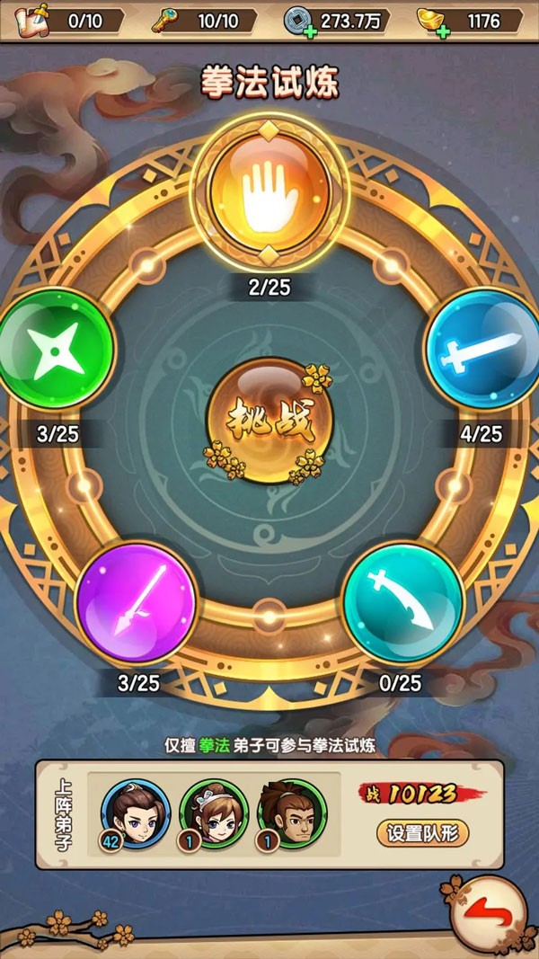 大殿3级解锁试炼,试炼又分为拳法、剑法、刀法、枪法、以及奇门等5种试炼类别,相应类别的弟子可出站对应试炼,挑战成功可获得该类别武学功法断章。