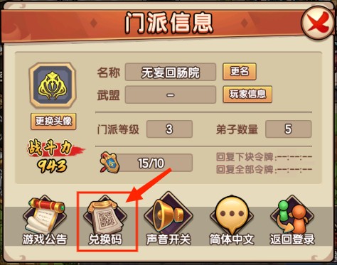 2、个人信息:点击头像可以显示门派信息,修改名称以及兑换码输入均在此界面可操作性。