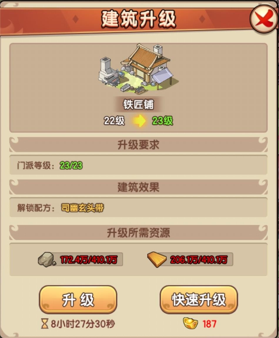3、资源产出栏:门派建设资源产出的基本信息,产出速度加成。