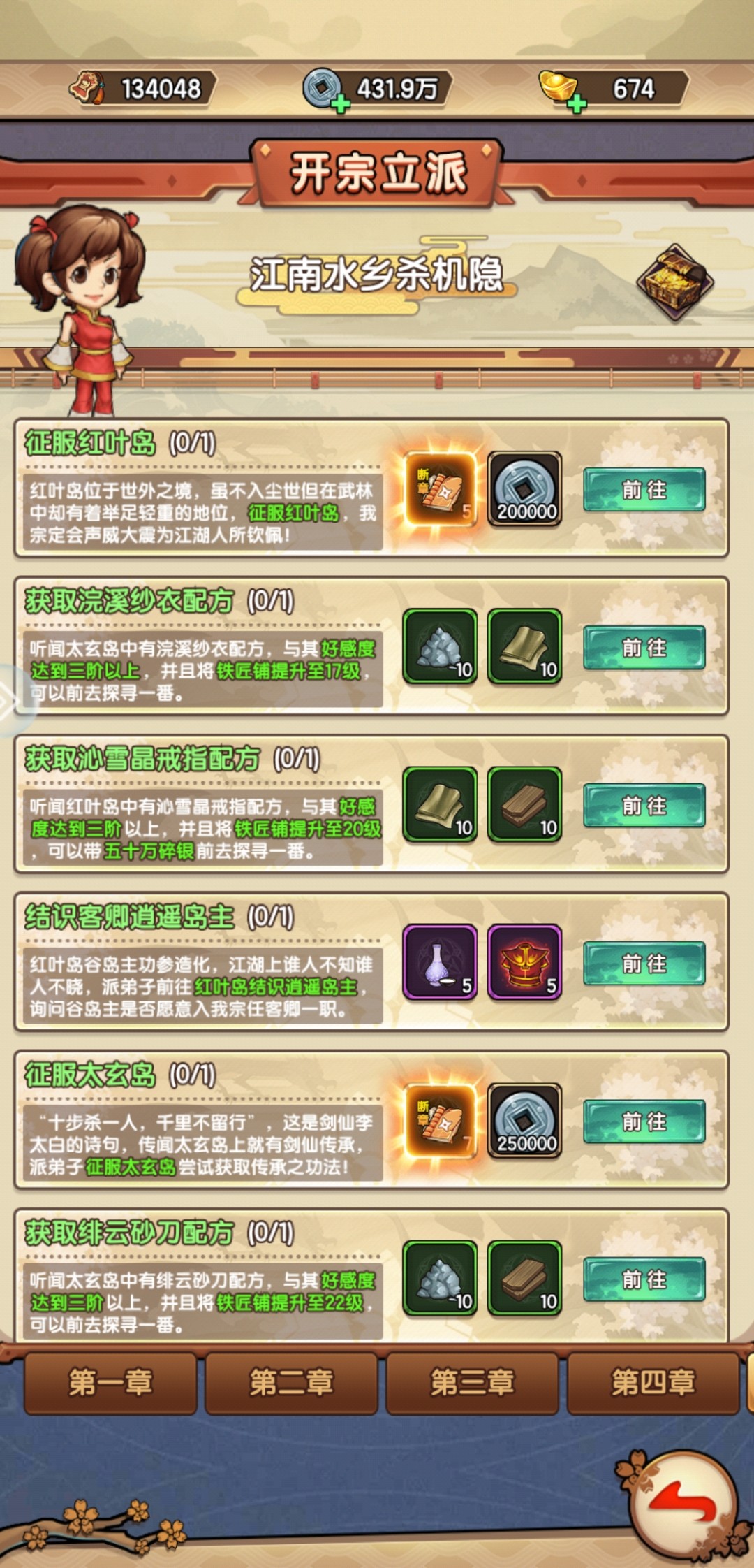完成征服峨眉派后就解锁开宗立派,在宗门建设的过程中,需要完成开宗立派的任务,获得元宝、建造资源、修行资源以及弟子等等多种资源的途径之一。