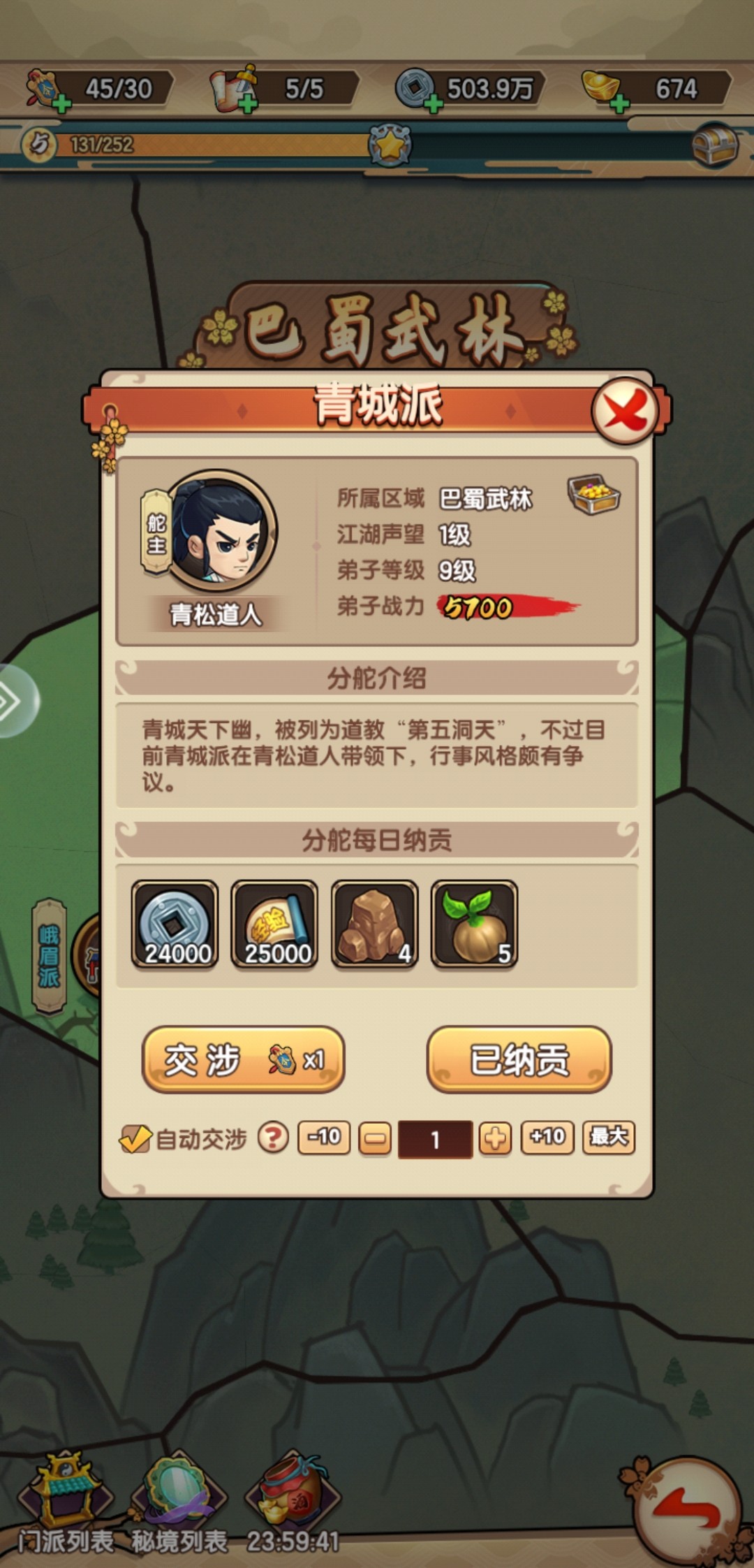 2、江湖门派:选择江湖门派开始交涉,可逐步提升门派关系,最终征服该门派,关系越高奖励越丰厚。