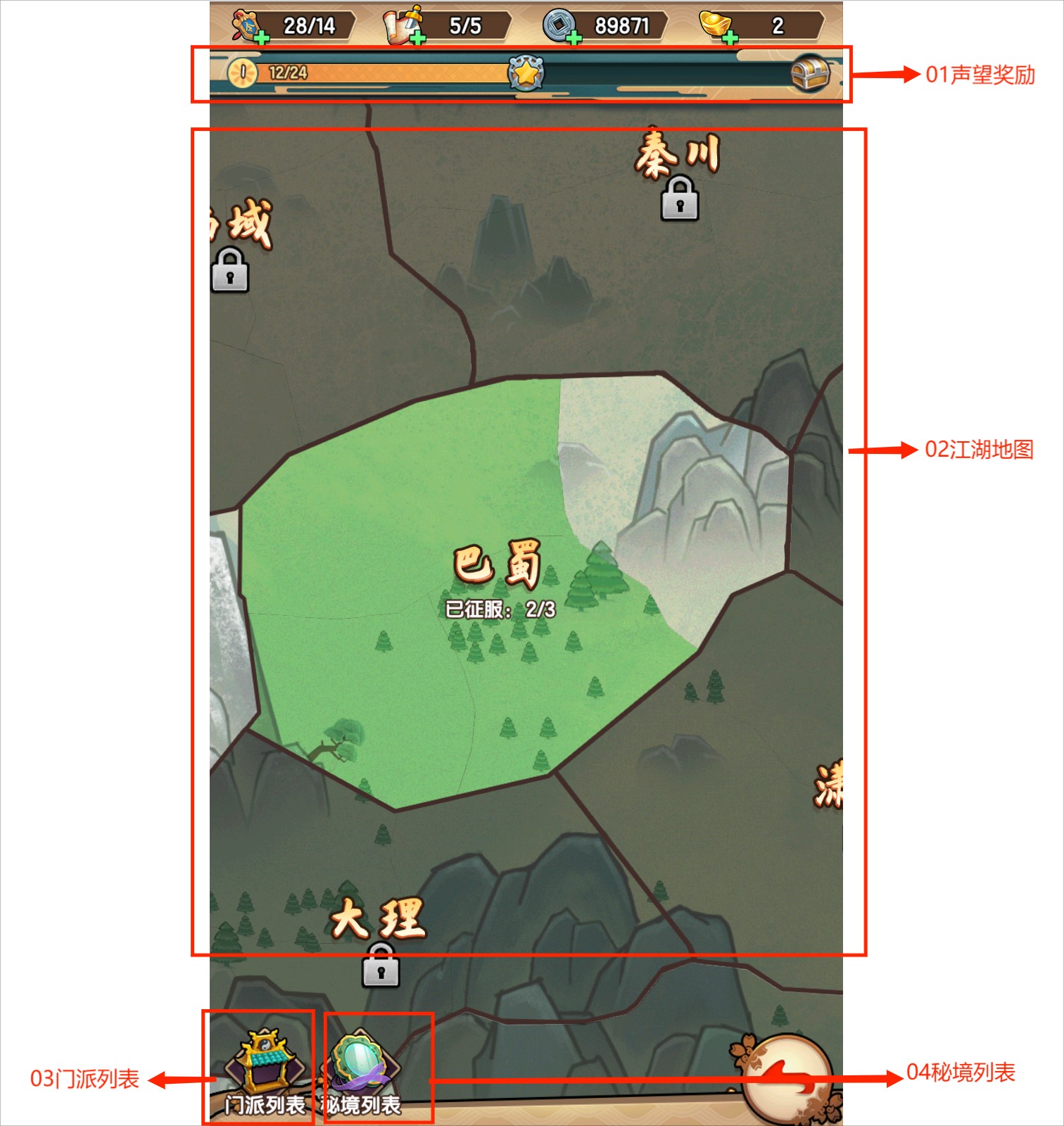4、秘境列表:征服部分门派后地图会出现秘境入口,挑战秘境可获得丰厚的奖励哦~