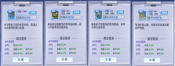 整个装备系统以套装属性为轴心展开,游戏套装分别分为:轻装上阵、作战精英、超能战姬、暗夜魅影、圣谕救赎。良心设定:套装属性是固定的,与品质无关,所以拥有强大的套装属性简直就是轻而易举。