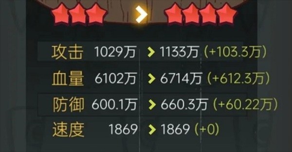 3、从一颗皇冠开始到五颗紫晶为止,每升一级加15%(攻击、防御、血量)。