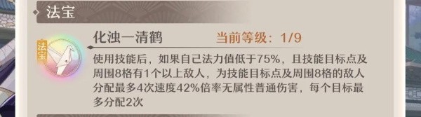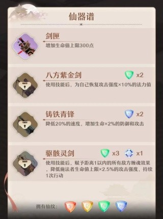 ④法宝:同样的,每个弟子拥有专属的法宝(每场战斗仅生效一次),多数法宝与其本身的主成长属性相吻合,其特效各位可在游戏中自行体验,不作过多描述。法宝可通过升级提升效果。
