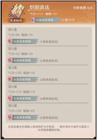 功法带来的属性:每张执念牌都自带2本功法,弟子可在炉子里进行修炼。修炼每本功法都具有主副两种属性加成,主属性与执念本身属性一致,也确定了其培养的方向。