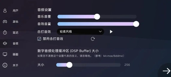 在音频设置模块,玩家可以调节游玩音量,以及调试缓冲区大小。