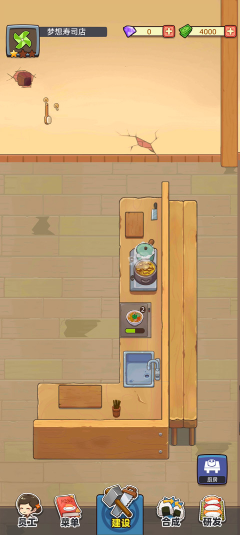 1、你突然接手以及奶奶留给你的一间看上去有些破旧的寿司店,你需要去仔细的打扫,装修,让这个店运行起来。