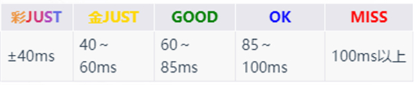 游戏对音符的判定共有5种,分别为彩JUST,金JUST,GOOD,OK与MISS。打出Miss时Combo会中断。五种判定的对应误差区间如下所示