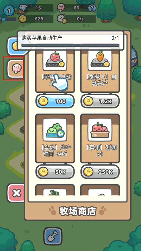 4、点击左上角的牧场商店,使用金币购买“苹果自动产生”,还能选择雪糕,升级指数,这样就能获取更多的收益。