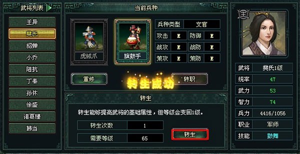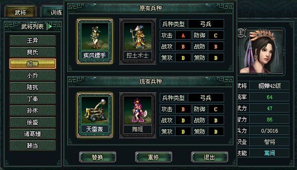 3、重修兵种如果对当前武将所携带的兵种不太满意,可以通过兵种重修获得自己满意的兵种。当然,武将的等级和职业决定了重修兵种时所能获得的兵种类型范围。
