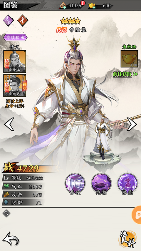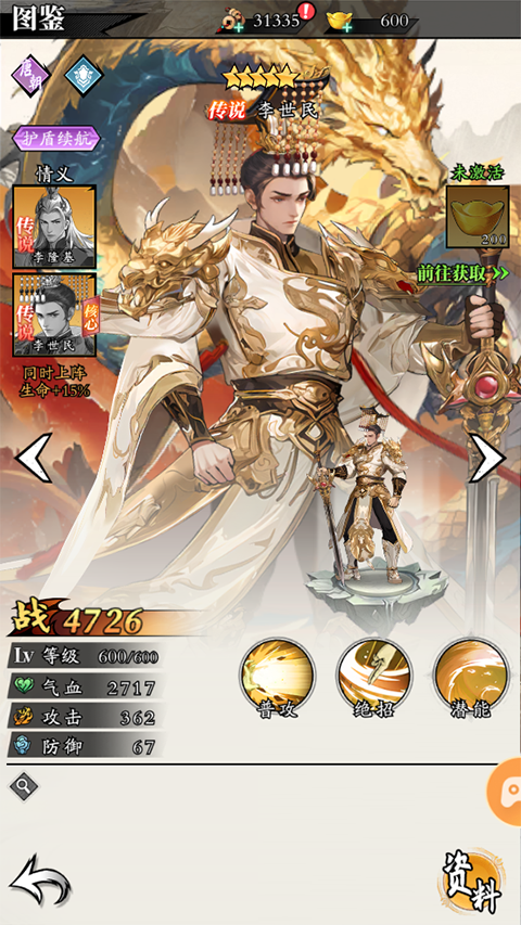 (2)绝招:对敌方单体造成200%伤害,并使全体队友获得李世民生命上限15%的护盾,护盾拥有15%伤害减免,持续2回合