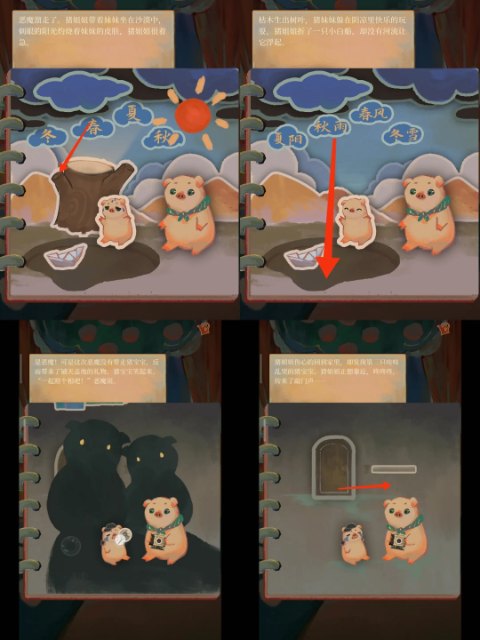 移动小猪去其他地方,水桶浇灭壁炉的火,得到故事书,“春去秋来,年复一年”