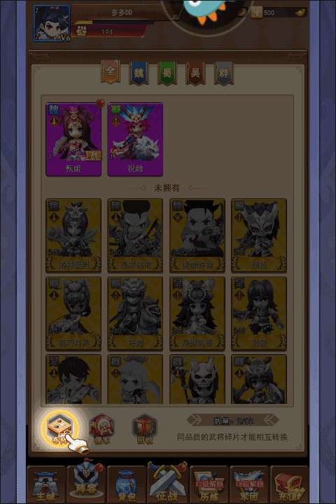 2、主公装备分为6个部位,常规部位为武器,头盔,衣服,鞋子,特殊部位为护心镜与锦囊
