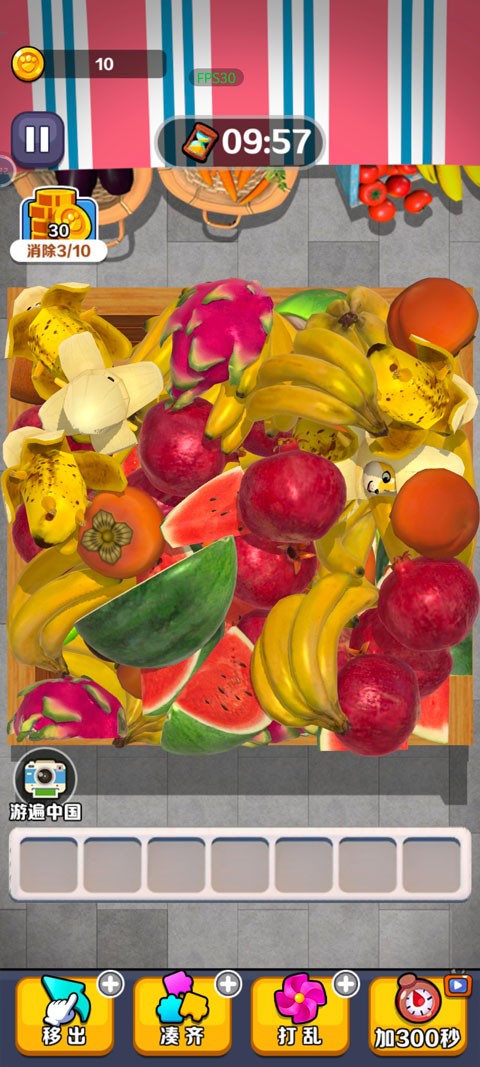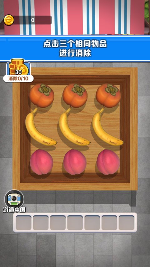 2、进入游戏如图,玩家需点击三个相同物品进行消除;