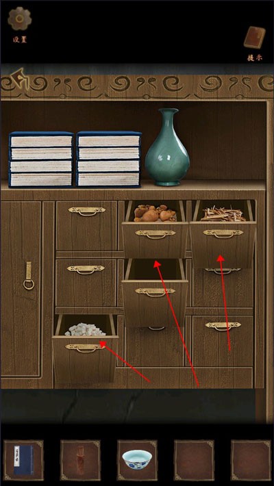 4、点击药柜,打开所有的柜子,在最中间的柜子里获得【火折子】和【空碗】