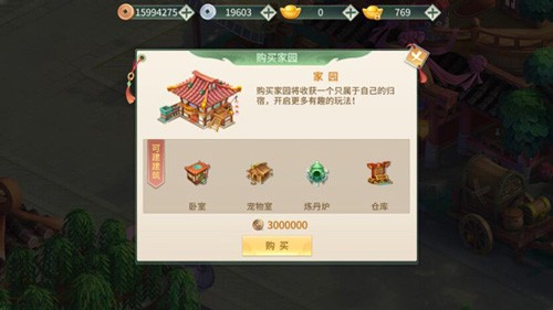 家园中共有卧室、宠物室、炼丹炉和仓库四种功能玩法。