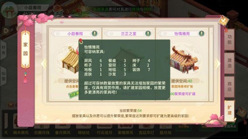 1、点击布置,购买家具进行摆放,家具有多种类型,分桌椅、床柜、墙饰、摆饰和地面,家具的价格也不一,价值高的家具增加的繁荣度更高,当繁荣度到达一定时可扩建家园。