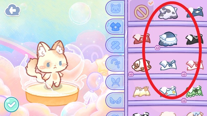 各种款式的衣服,可爱的配饰,精美的鞋子,还有各种手持物品,包括翅膀!发挥你的想象力,为你的宠物打造最可爱、最时尚的造型!
