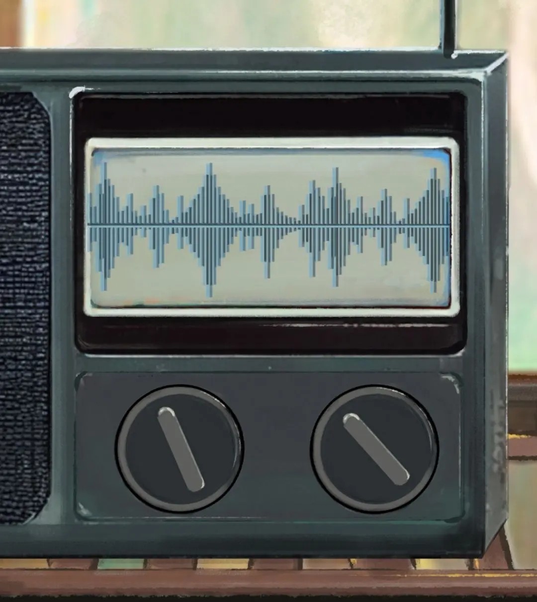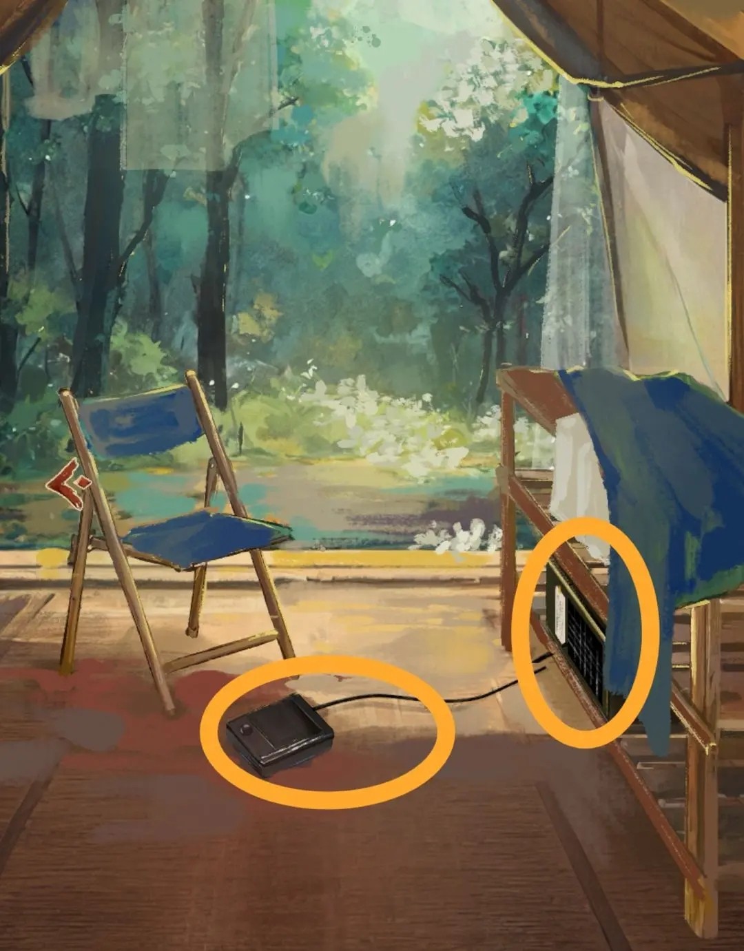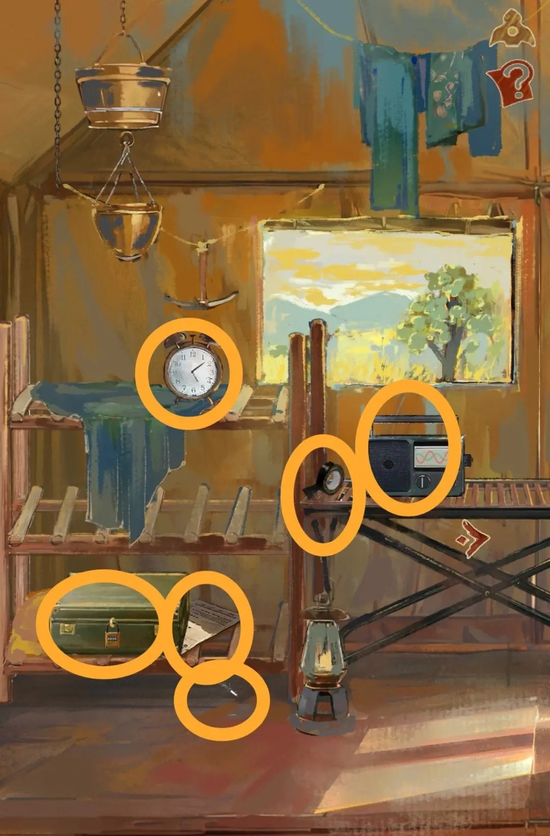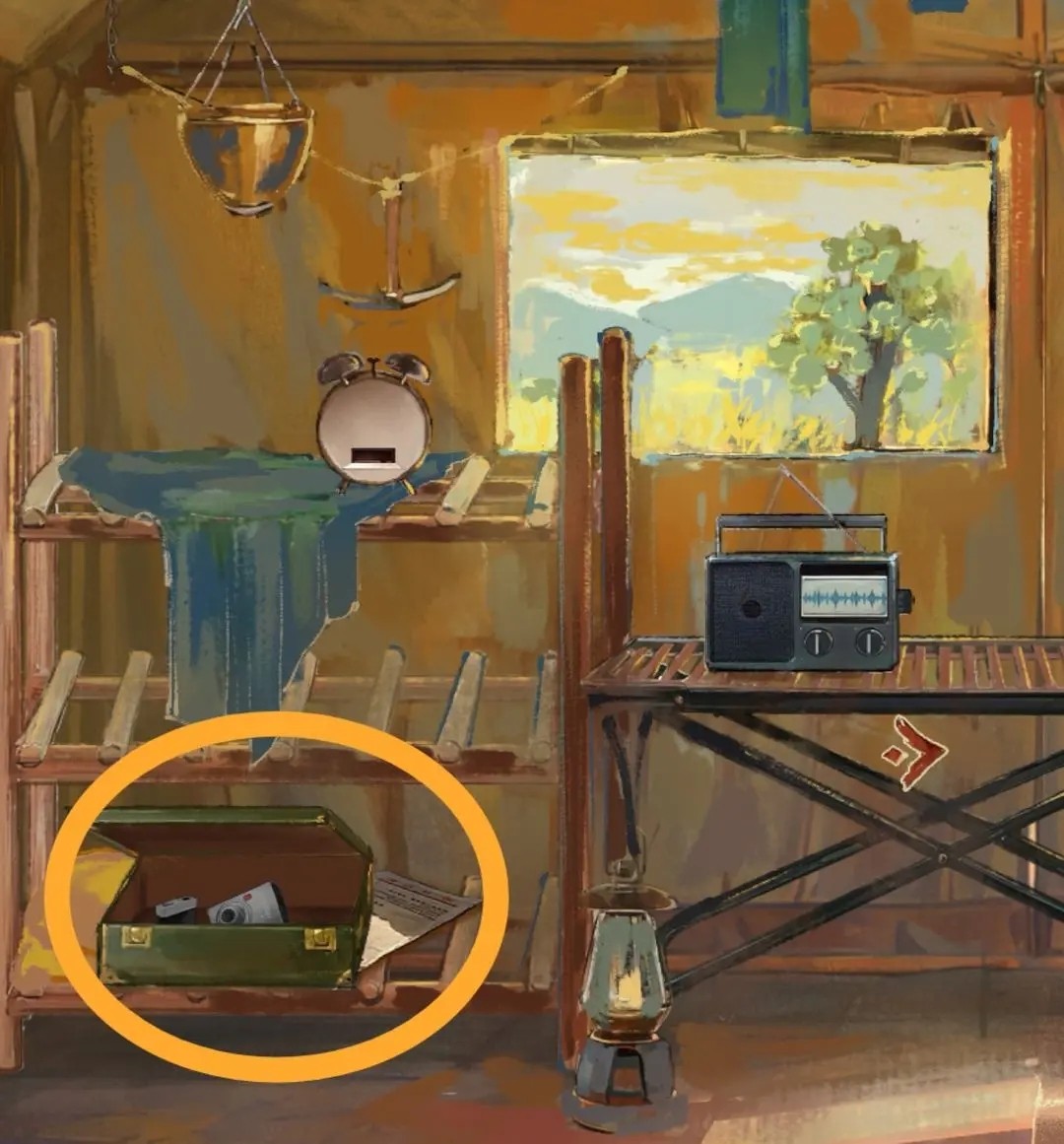 木头板子下面是折断的天线,收音机旁是胶布,在物品栏里打开坏天线,把胶布托上去获得完好的天线,把好天线放到收音机上,移动收音机上的两个按钮(如下图),使两条波长重合。