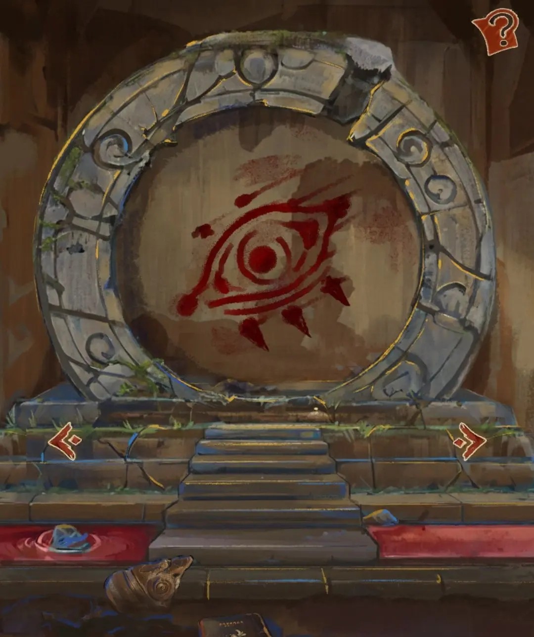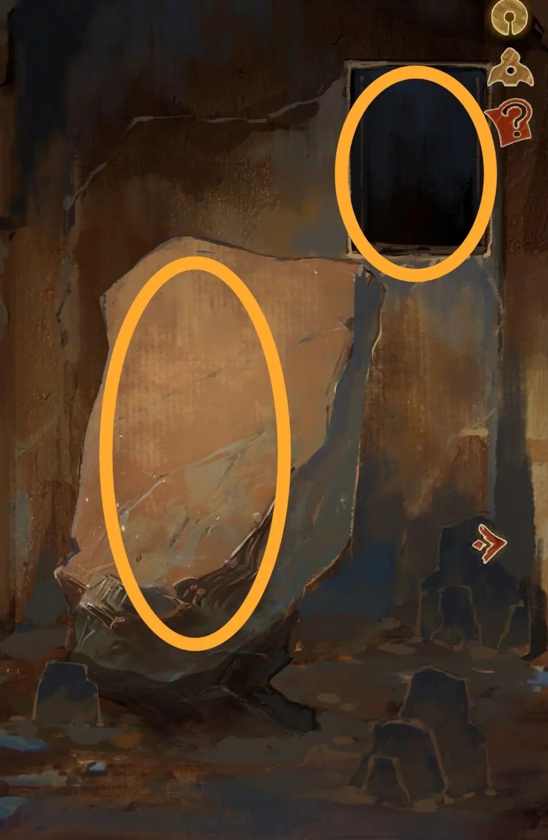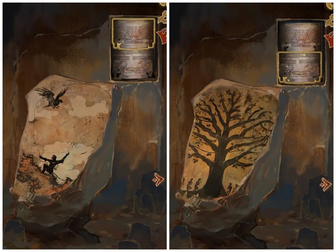 将两个神人面具放在最左边场景右上角的方形空隙中,依次点击两个面具,前面的大石头上出现两个图案。