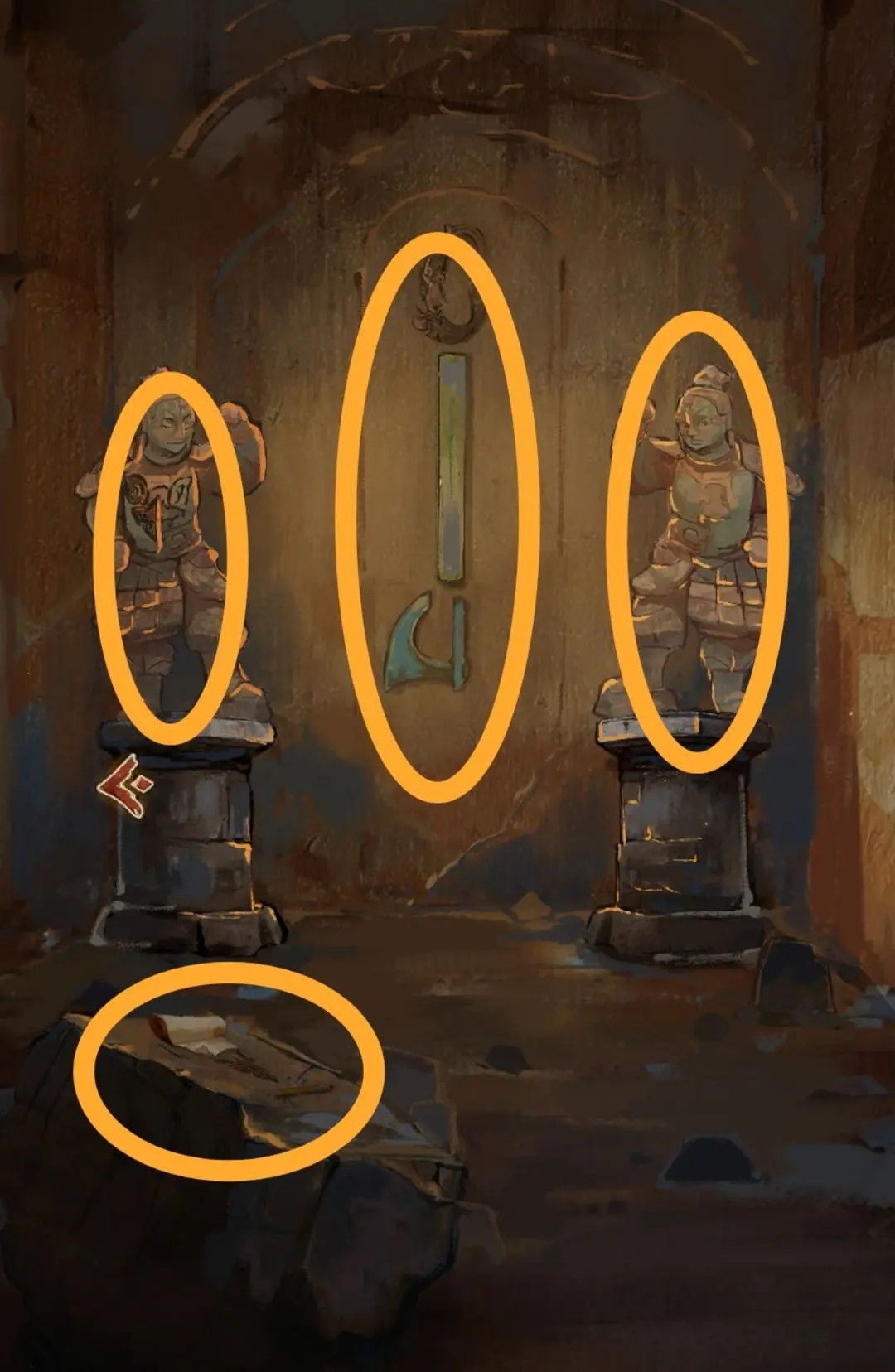 在雕像前面的大石头上拓印下一个图案,点击左右两雕像得知一个要武器一个要纹饰图案,把拓印下来的图案移到左雕像上得到神人面具。