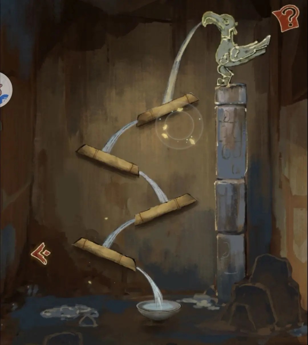 找到水流场景,将竹筒方向调整如下,使下方玉瓷碗中盛满水拿走(注意:竹筒方向不是一直保持原位,回去的速度比较快)