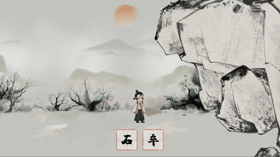 1、引导主角向右行进,与驻守士兵对话后,将士兵形象与旁边的石块收入物品栏,分别获得“石”与“卒”字,将其结合生成“碎”字,再将其应用于石块上。