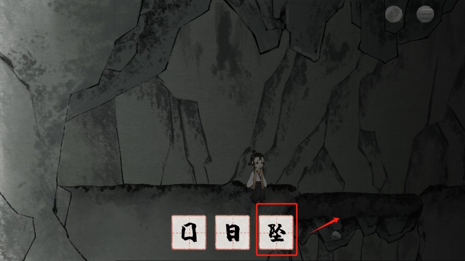 2、深入洞穴后,发现囚犯,收集后获得“囚”字。随后,返回洞口,左移至土堆位置,将“土”字收集,同时抬头观察,获取“阳”字。