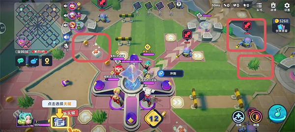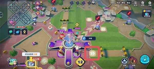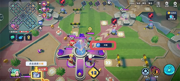 1、点击冲刺人物会快速向箭头方向移动,到达己方第一座防御城时停止。