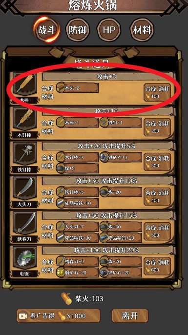 4、进入熔炼火锅,花费100柴火,炼制木棒道具