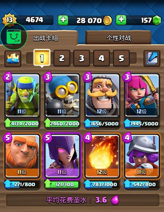4、部落冲突皇室战争无敌版对战时,拖动卡牌,消耗圣水将卡牌召唤到阵地上进行战斗,前期只能召唤在己方阵地上,如果推掉敌人两翼的公主塔可以将召唤范围扩大。