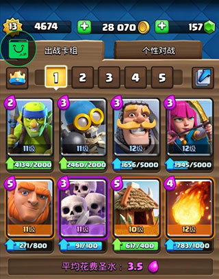 3、对战开始,被选入出战卡组中的卡牌会随机出现在卡槽中(卡槽中会同时出现四种卡牌,卡槽旁会显示下一张将出现的卡片),每位玩家初始会拥有5滴圣水(圣水随时间增长,最多储存10滴圣水),召唤不同的卡牌会消耗数量不等的圣水。