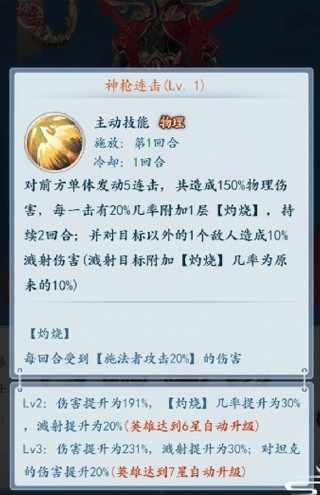 技能方面,其大招也就是主动技能,可以对前方单体造成五连击,共同造成高额百分比例的物理伤害。除了这点基础攻击以外,每一次攻击还有额外20%的几率附加一层灼烧状态,持续两回合。同时,该灼烧状态对目标造成周围的敌人10%的溅射伤害,同时,溅射之后还会给周围敌人有几率造成灼烧。
