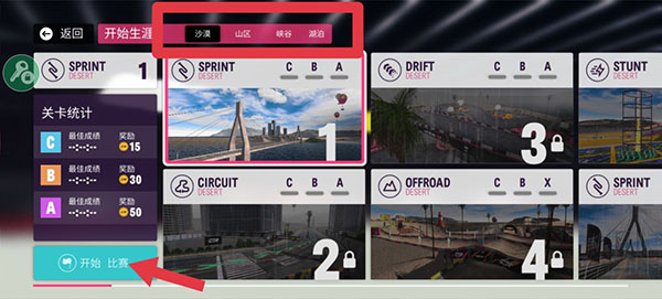 5、可以选择不同的地形,点击开始比赛。