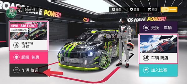 1、在游戏首页选择车辆校调功能。