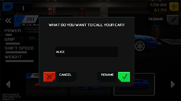 2、玩家可以选择车库中比较喜爱的那几辆为它们取昵称,昵称会在比赛结束时显示
