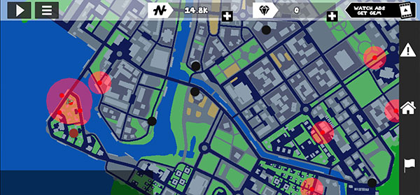 左侧移动、加速,右侧绳索,攻击(跳跃),跳跃,右上侧的武器更换以及血量、经验的显示都实时更新,一览无遗,凭借着大家自由的玩法,与其他帮派的人物进行交火,期间杀人能够获得经验,杀多了会产生星级,警察和其他附近角色会特殊照顾你对你展开火热的进攻,而如何存活,如何将其他人物击杀则是你所需要完成的任务。