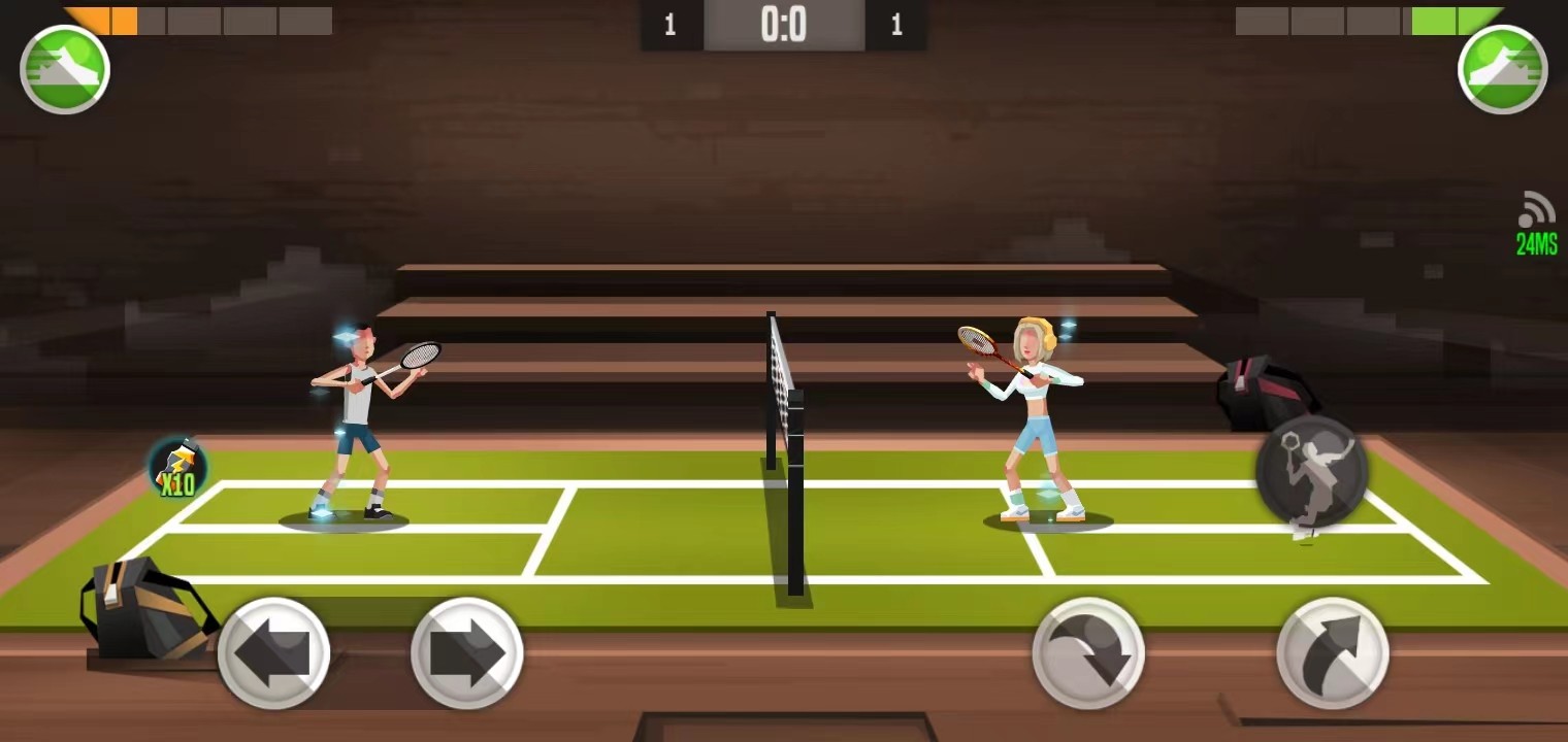 4、左边的按钮是控制向前或者向后移动,右边的按钮则是负责接球,当羽毛球掉下的时候会有一条白色的线,玩家需要看准时机,点击右下方的按钮,把羽毛球打回去;当左上角的圆形满了以后,还可以出发扣杀技能;