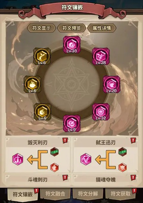 分解多余符文获取符文碎片,强化现有符文的等级。