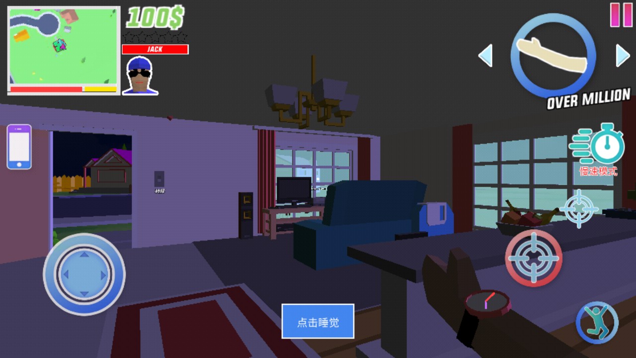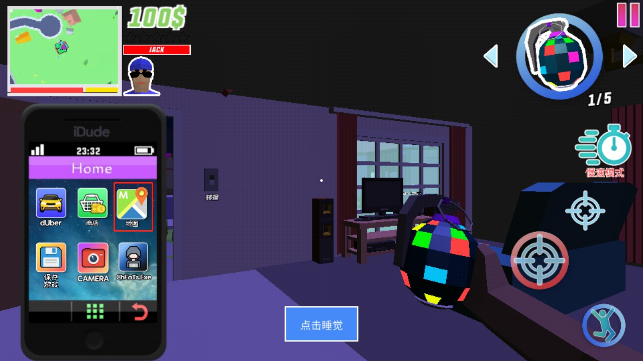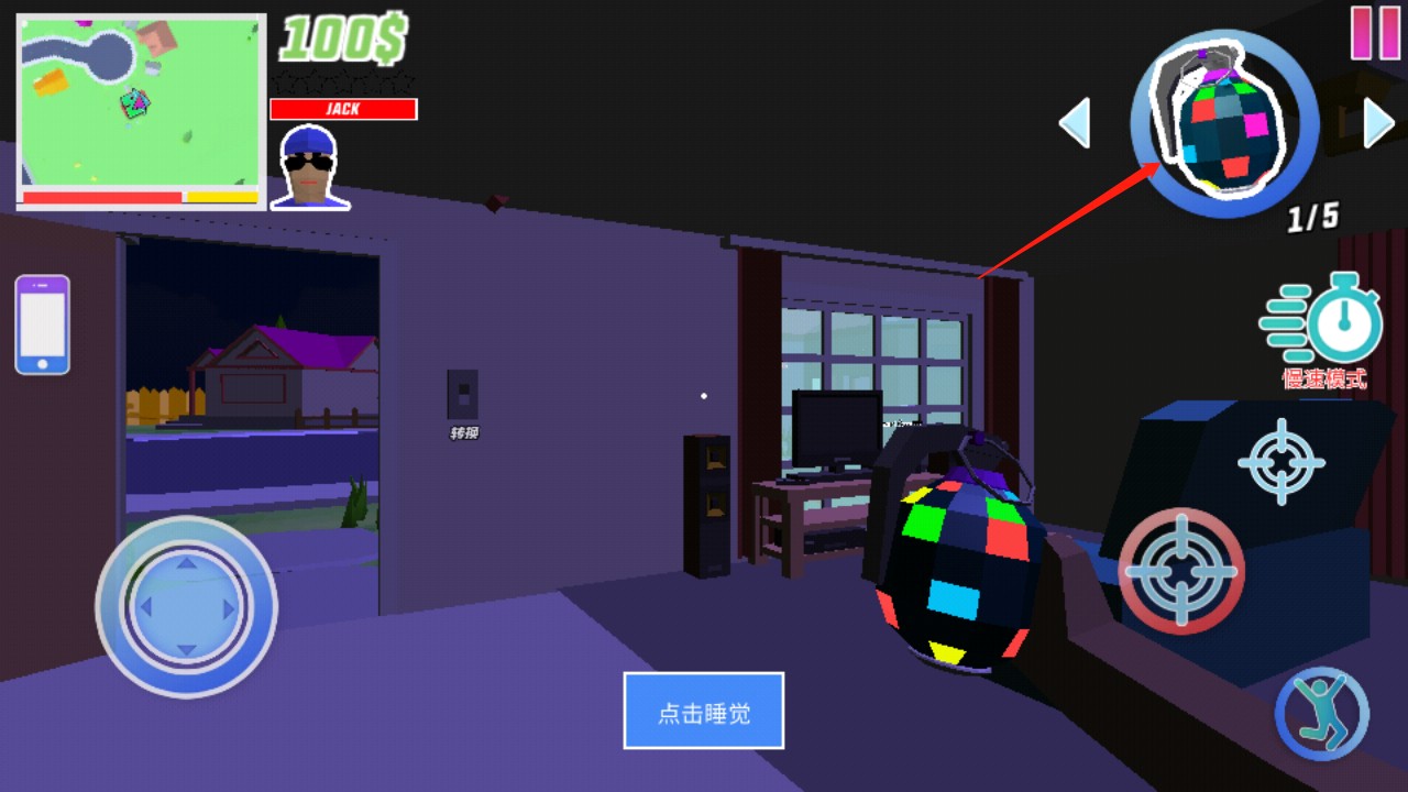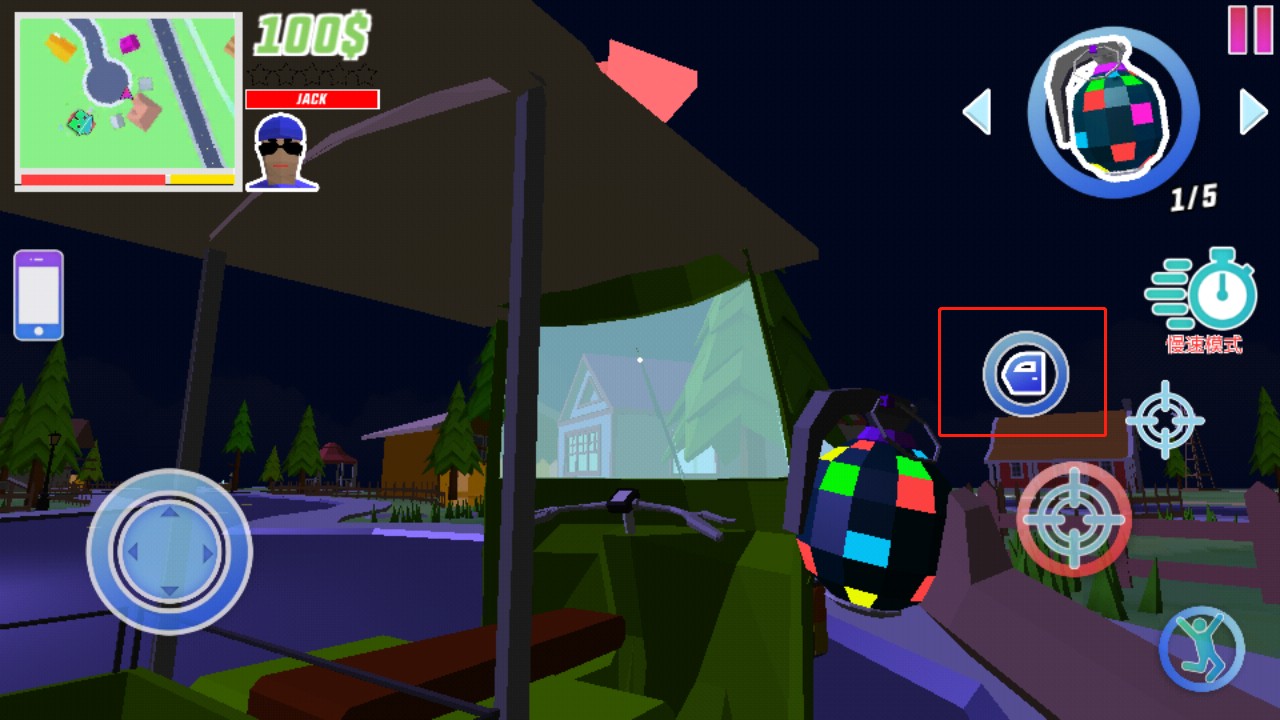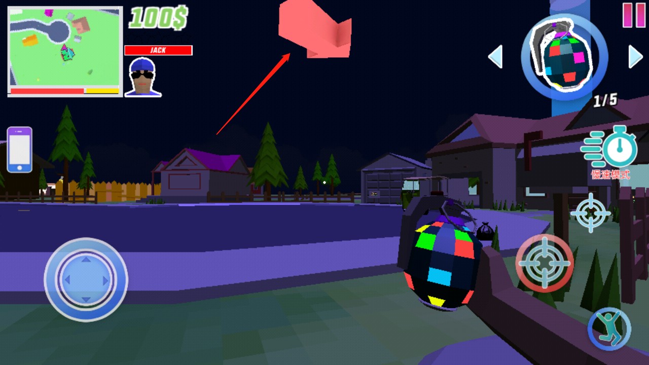 7、左边的按钮是控制角色移动的,而右边的按钮,靠左边的是控制角色攻击别人,右上方的按钮是瞄准,右下方的按钮是跳跃,点击右上角的这个地方可以切换工具;
