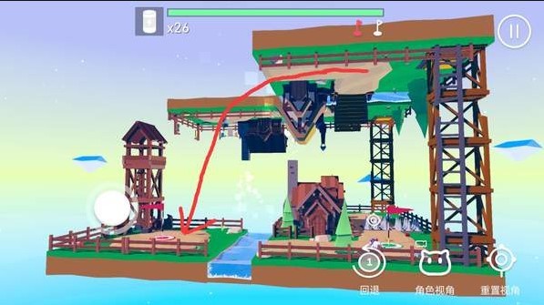 8、现在的问题是怎么到下平面的河对面,通过观察可以发现,需要踩踏下平面的两个按压机关,这样就能把桥连上!