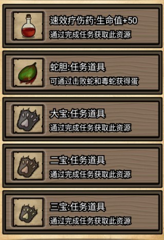 5、速效疗伤药、蛇胆、大宝、二宝、三宝;